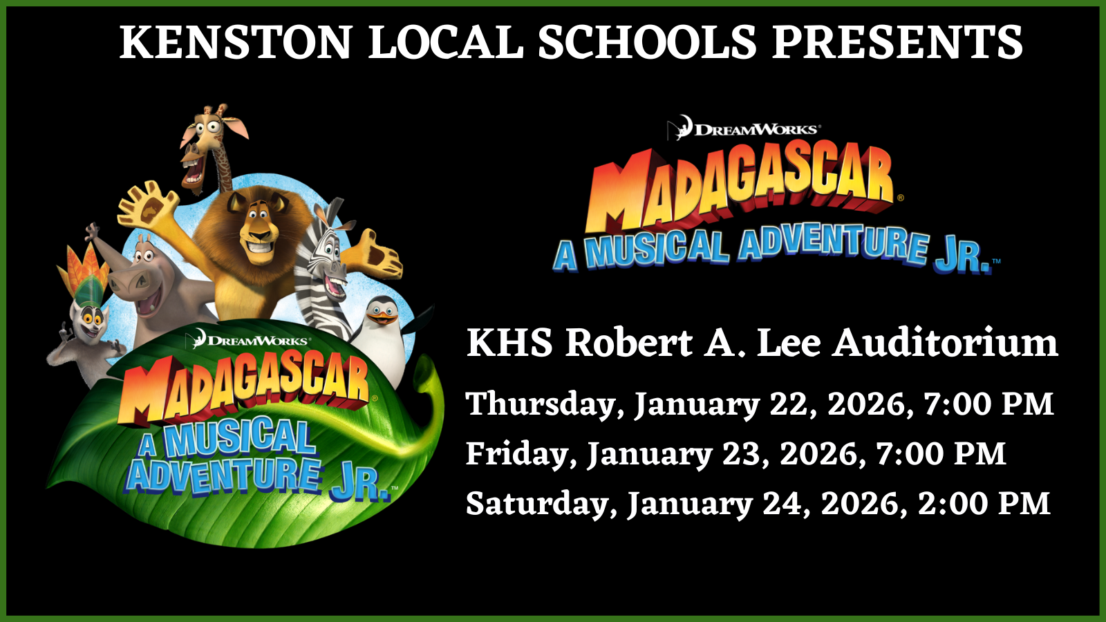 Adventure is coming to the Kenston Stage as the 6th, 7th, and 8th-grade students present “Madagascar! A Musical Adventure, Jr.” January 22, 23, and 24, 2026. You won't want to miss the show starring our talented students, as the musical promises to entertain audiences of all ages.