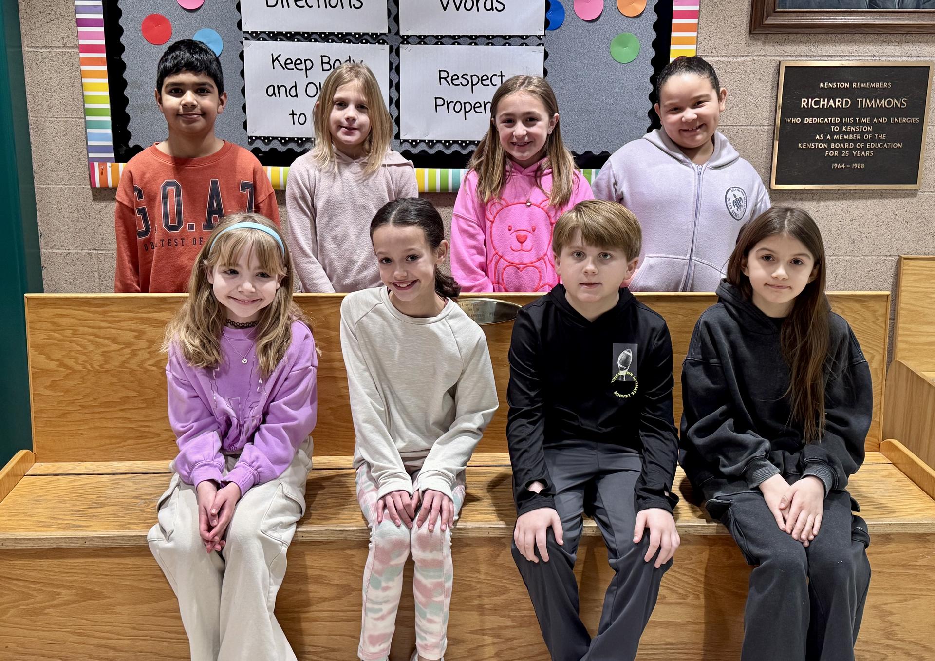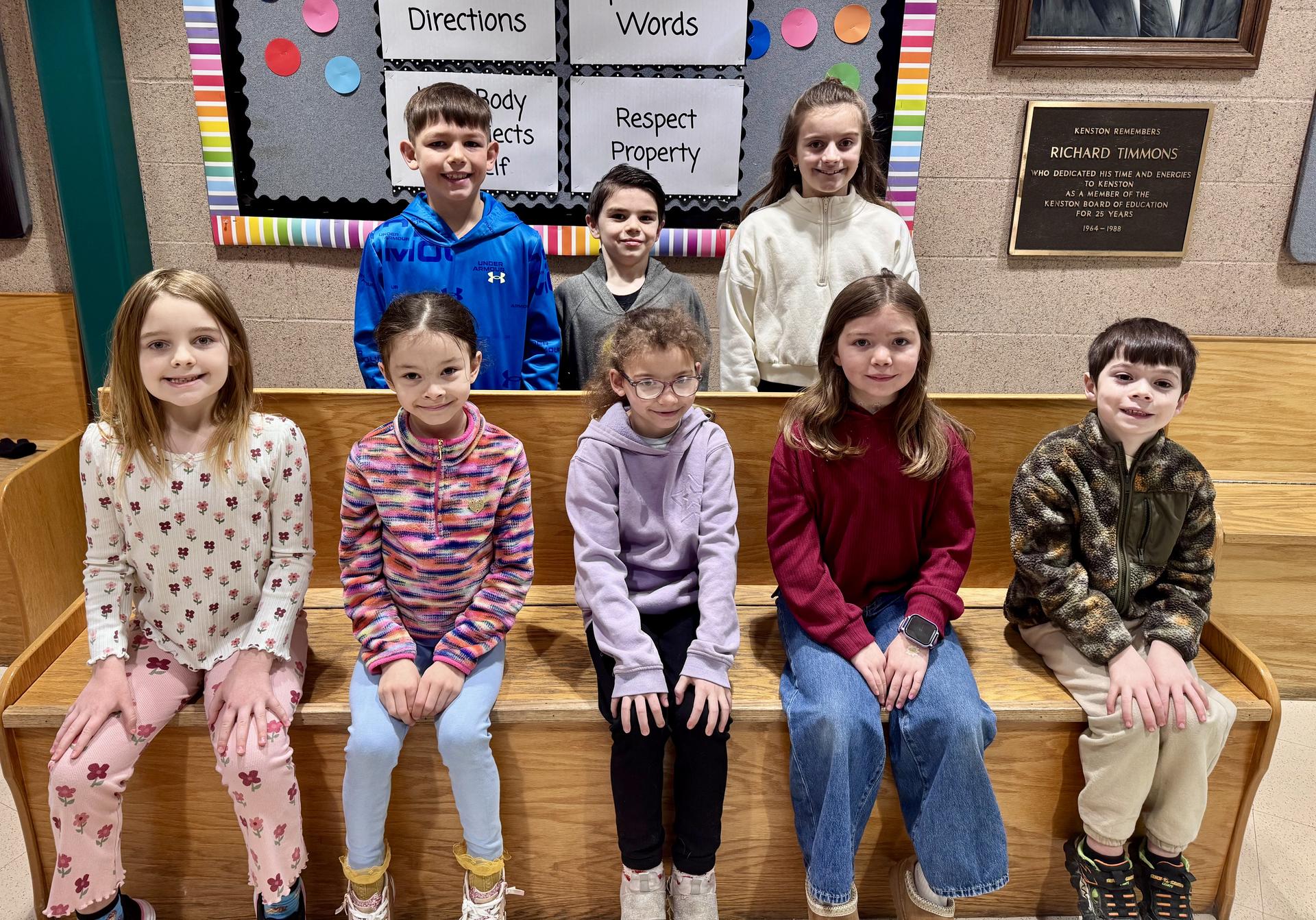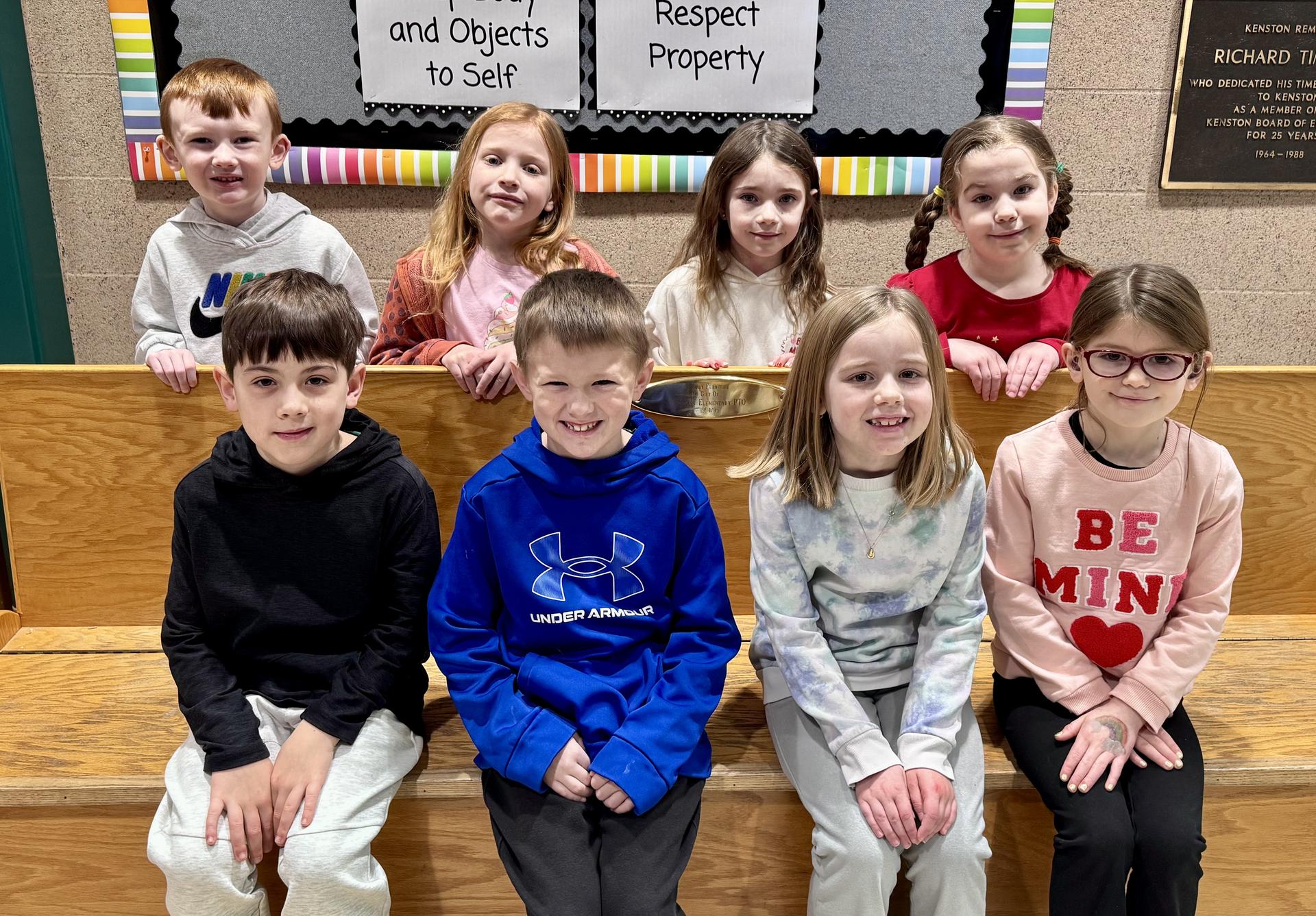 Third-grade Lunch Bunch students were selected for Self-Control in January. Congratulations to (back row, l-r) Harjap Singh, Elora Crawford, Sophia Elliott, and Mikyah Simmons; (front row, l-r) Charlotte Cron, Kasey Smearcheck, Logan Tutor, and Blakely Coates. |
