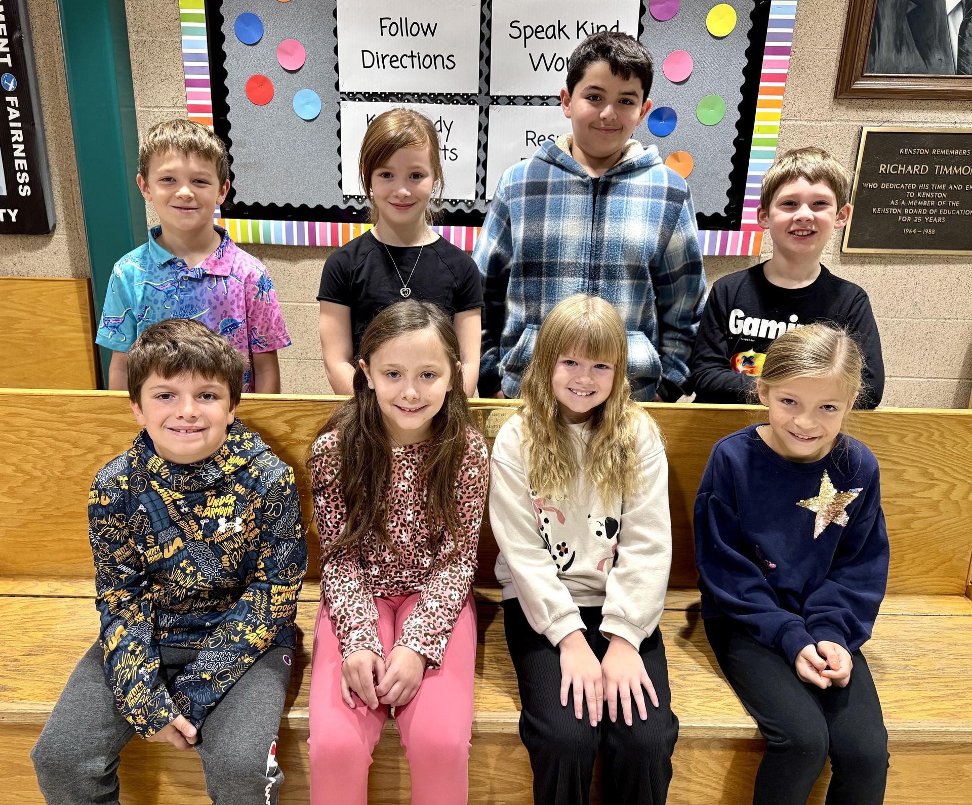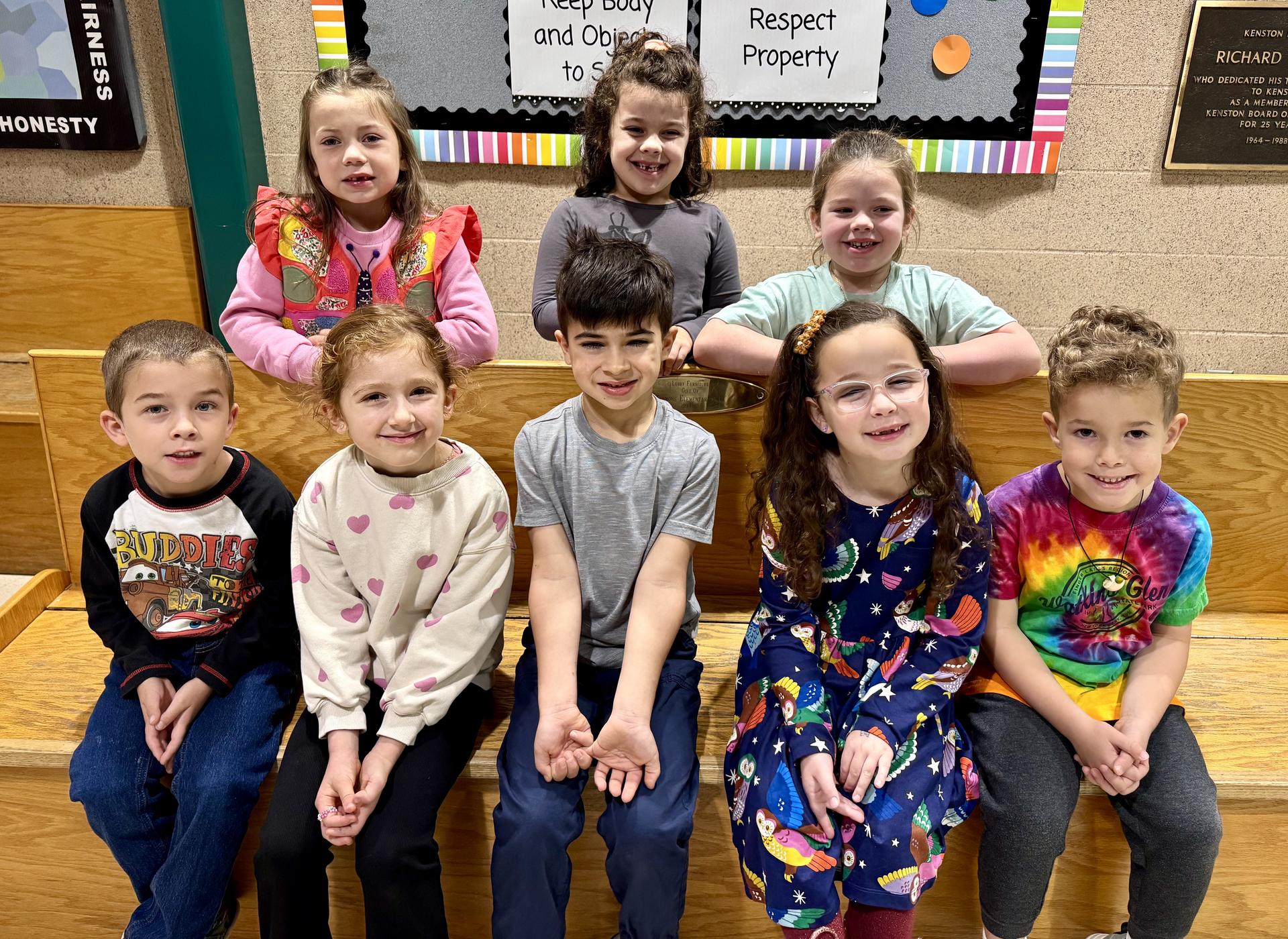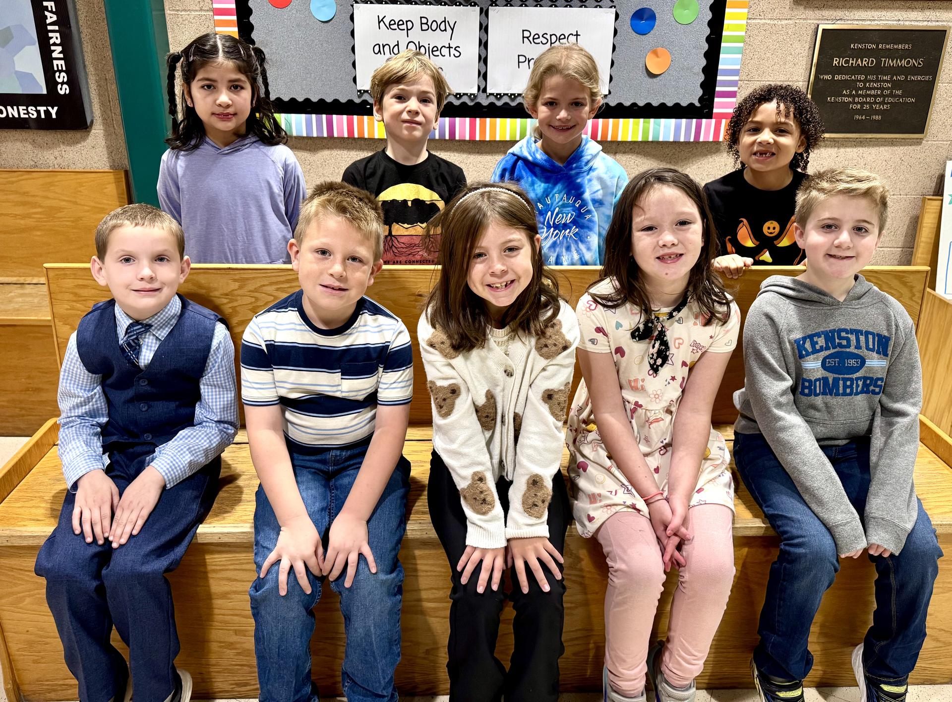 Kindergartners selected for Kenston's Timmons Elementary Lunch Bunch for their Respect in October were (back row, l-r) Quinn Kita, Aislin Clune, and Isabel Monroe; (front row, l-r) Patrick Viau, Maya DiLorenzo, Everett Latifi, Isabella McGarvey, and Cole Smearcheck. (not pictured: Maddie Briggs) |