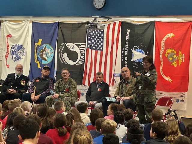After the students completed the music program, guest speakers from the various military branches of the Armed Forces joined our third-grade students to share their stories. These speakers were parents, grandparents, aunts, uncles, family, and friends who are currently serving or who have served in the military. They were invited to share military mementos, pictures, medals, models, etc., but most importantly, their words, as the students gain so much from hearing about their experiences.